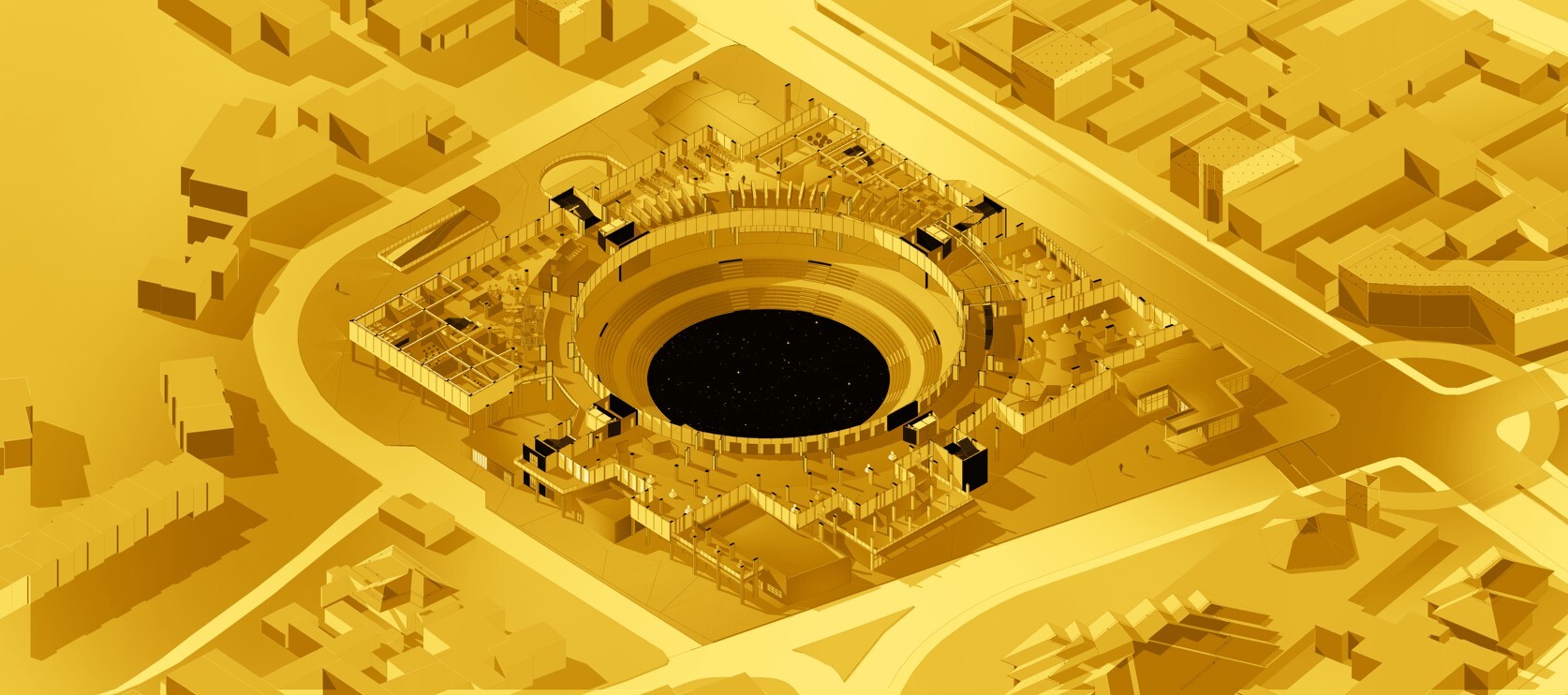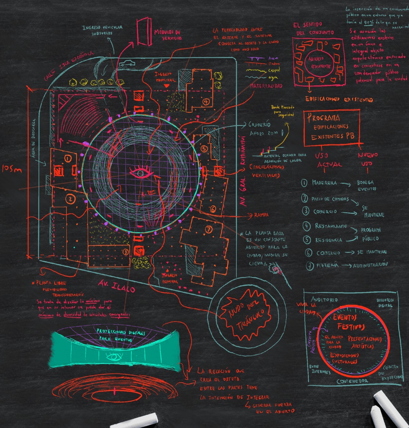 La arquitectura es el arte de sintetizar. Este proyecto, aparentemente simple, logra integrar un programa diverso dentro de las formas puras de un círculo y un cuadrado, unificando 7 edificaciones existentes y 10 predios en un solo concepto arquitectónico.