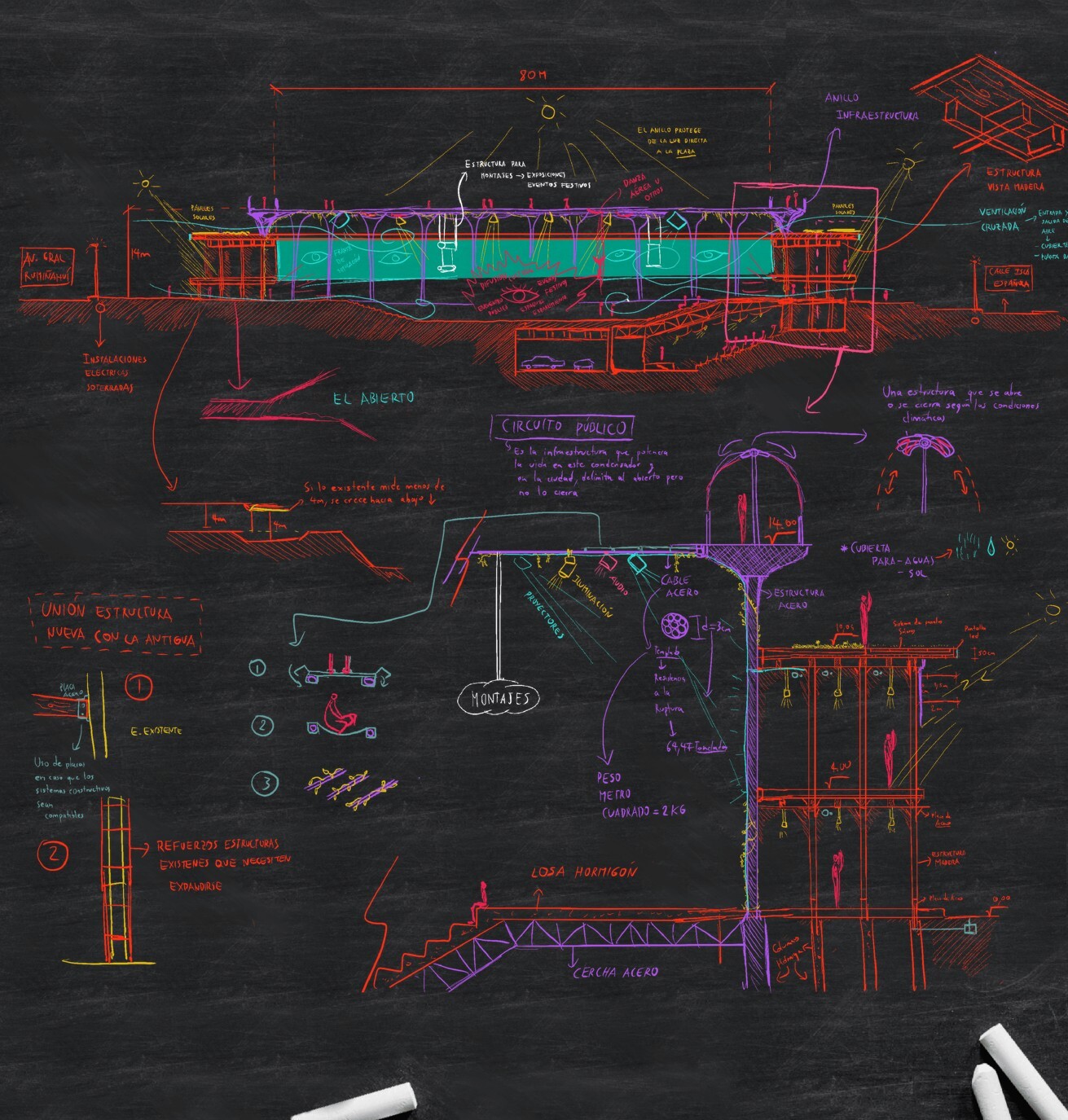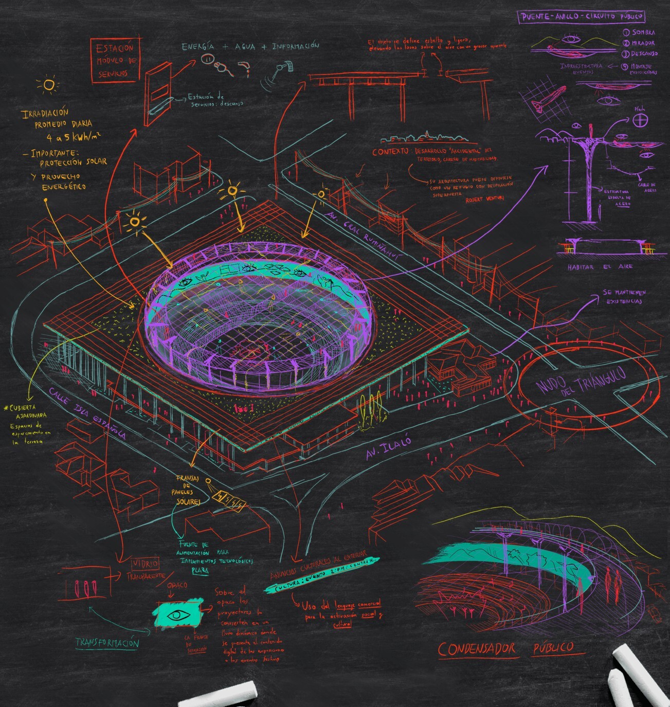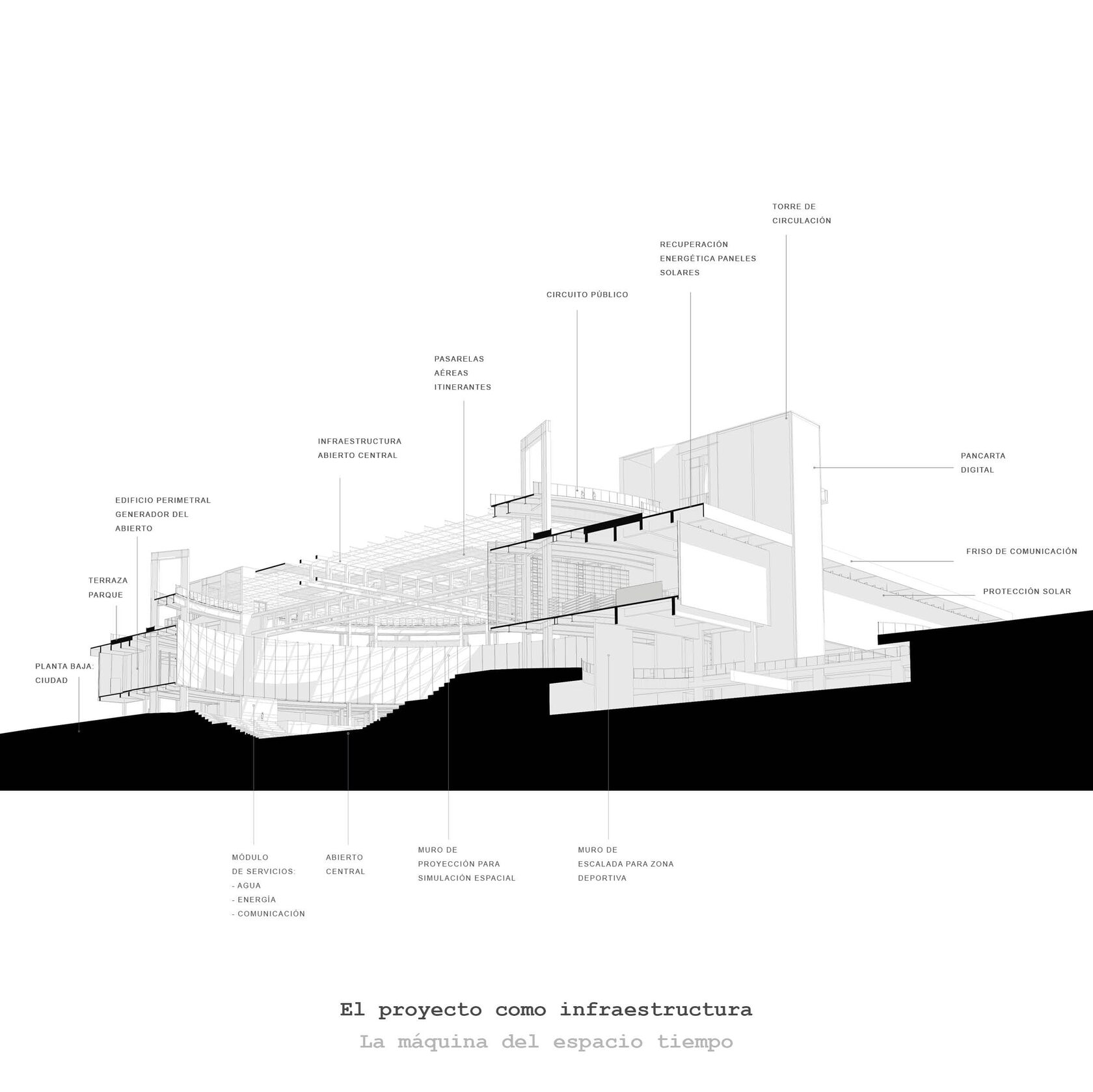 El proyecto se compone de múltiples elementos estratégicos: una superplaza, un friso de comunicación, una torre de circulación, un mirador público, aleros con paneles solares, una planta baja libre con topografía variada, y más. Inspirado en referentes como el Fun Palace de Cedric Price y el Condensador Público 24 de Mayo en São Paulo, este proyecto adapta esas ideas a la realidad ecuatoriana, creando un espacio memorable y funcional para la comunidad.
